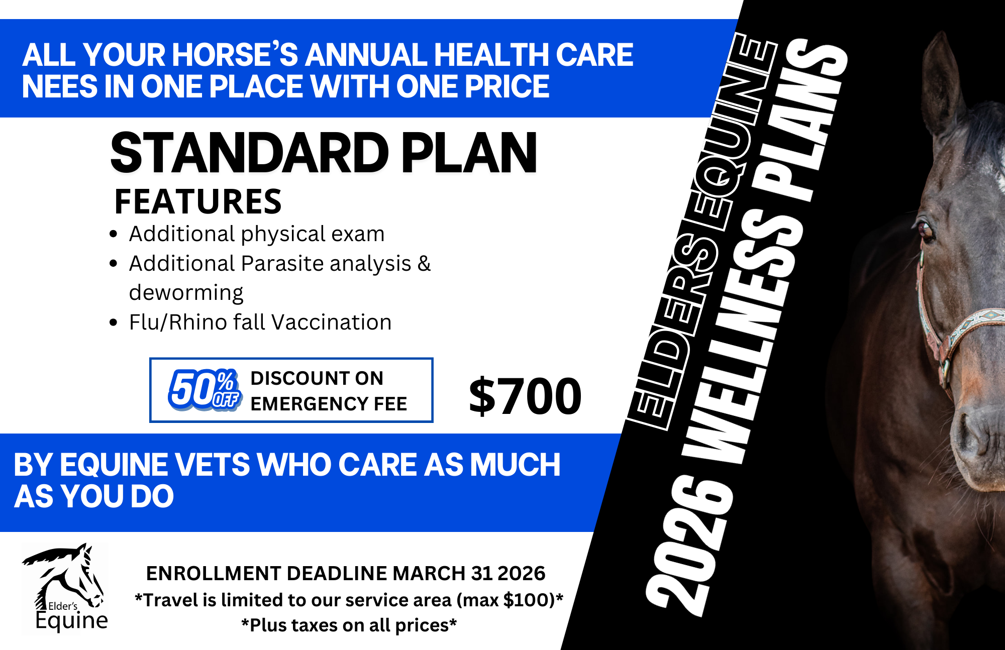 The Standard Wellness Plan builds on your horse’s essential annual care with an additional physical exam, extra parasite analysis and deworming, and fall Flu/Rhino vaccination. Designed for owners who want a higher level of preventative care, this plan also includes 50% off the emergency fee, helping you save when it matters most. With one clear price and trusted equine veterinarians, the Standard Plan offers greater protection, predictable costs, and confidence in your horse’s health year-round.