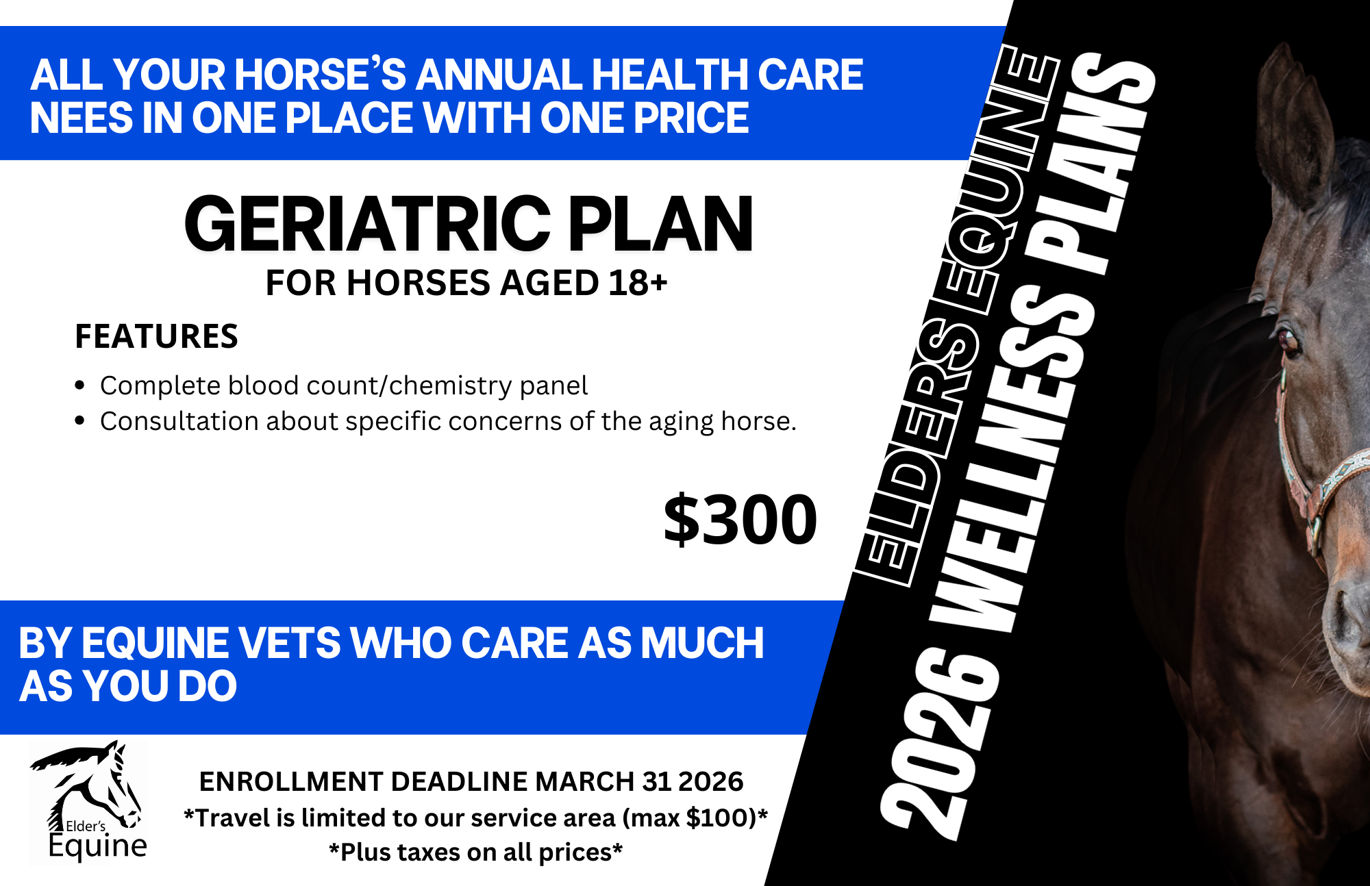 The Geriatric Wellness Plan is tailored specifically for horses aged 18 and older, focusing on early detection and individualized support as their needs change. This plan includes comprehensive bloodwork and a dedicated consultation to address age-related concerns such as weight changes, metabolic health, comfort, and overall quality of life. With one simple price and trusted equine veterinarians who understand senior horses, the Geriatric Plan offers clarity, proactive care, and peace of mind for owners committed to their horse’s long-term wellbeing.