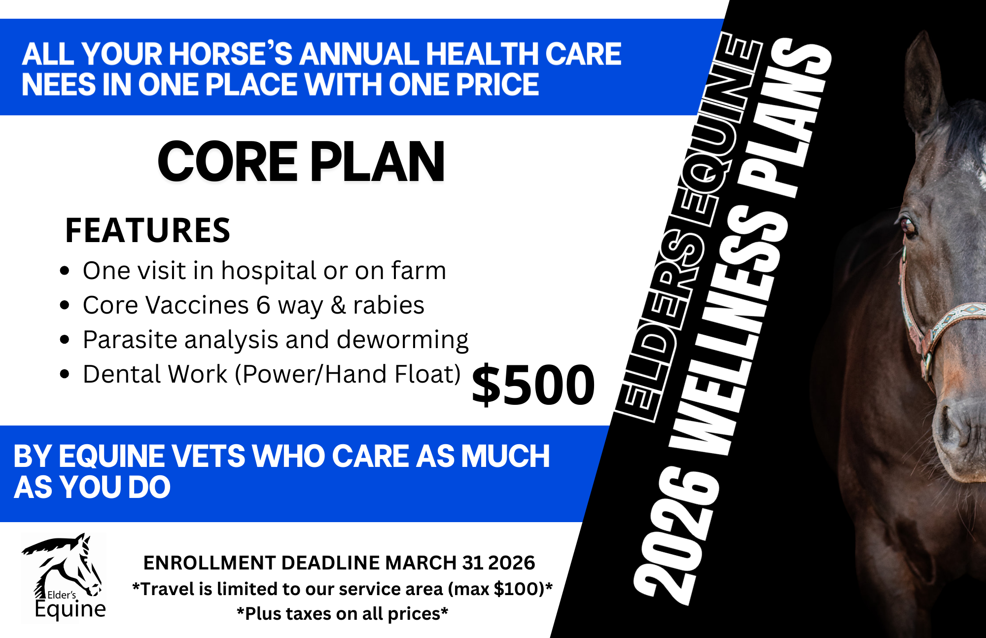 Our Core Wellness Plan covers your horse’s yearly health essentials in one streamlined package. From core vaccines to dental care, it’s an affordable, hassle-free way to stay on top of your horse’s health while keeping costs predictable.