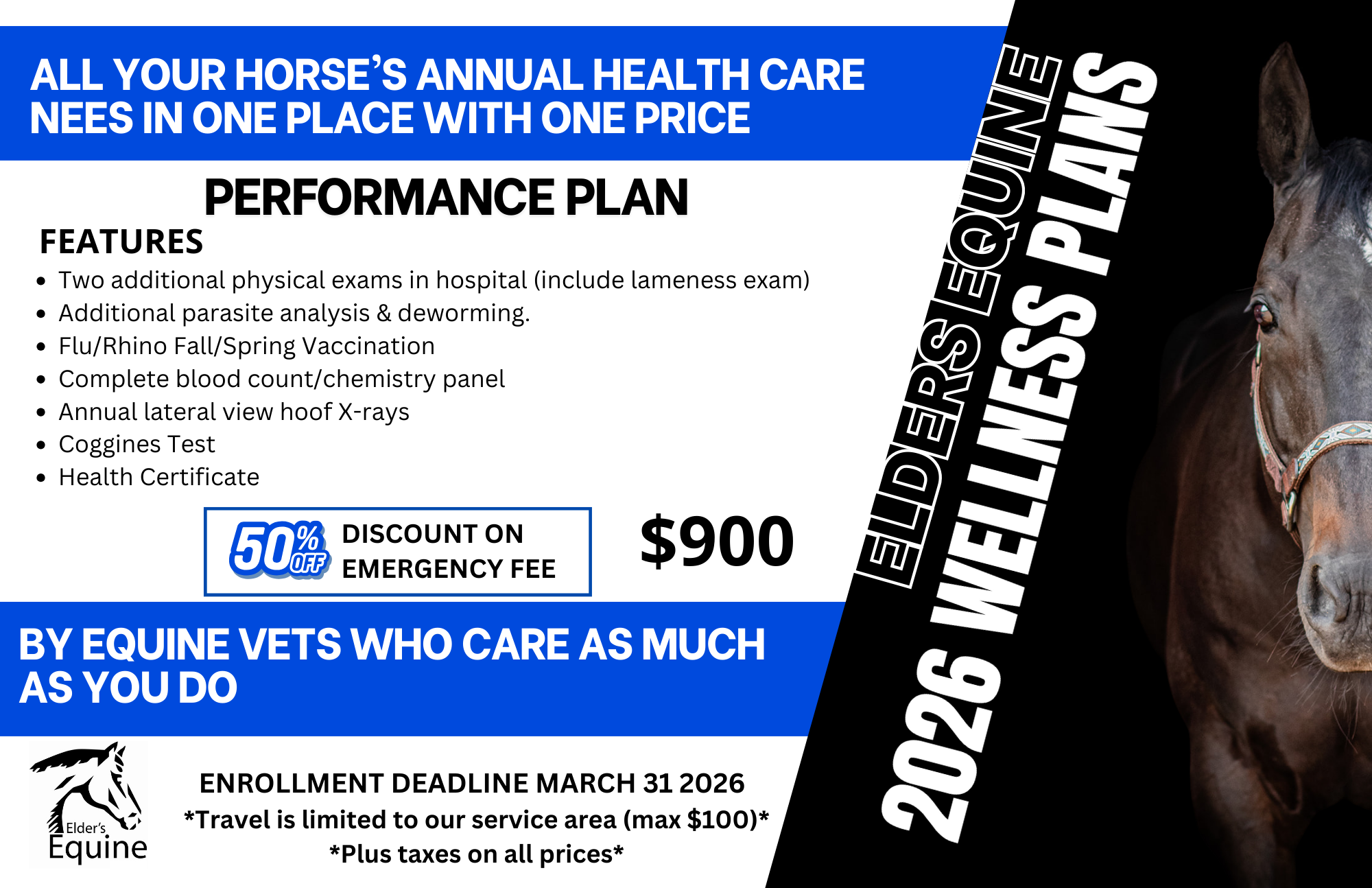 The Performance Wellness Plan offers advanced, proactive care for horses in training, competition, or frequent travel. This comprehensive plan includes multiple in-hospital physical and lameness exams, expanded parasite management, seasonal Flu/Rhino vaccinations, full bloodwork, annual hoof X-rays, Coggins testing, and a health certificate. With 50% off emergency fees and one predictable price, the Performance Plan delivers in-depth monitoring, early issue detection, and confidence that your horse is supported at every stage of their performance season.